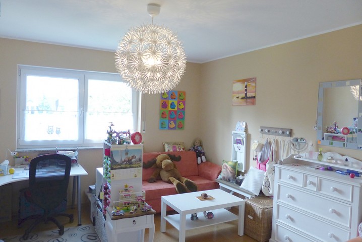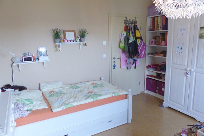 Das derzeitige Schlafzimmer bietet mit ca. 12 m² eine funktionale Fläche für Bett und Schrank. Gegenüber auf der linken Flurseite finden Sie das Kinderzimmer mit ca. 17 m². Dieses Zimmer kann auch anders genutzt werden, z. B. als Elternschlafzimmer oder Home Office. Beide Räume sind mit Kork ausgelegt.