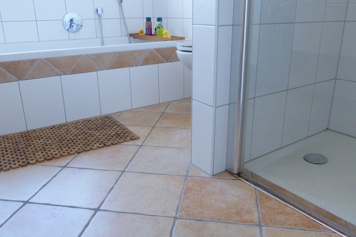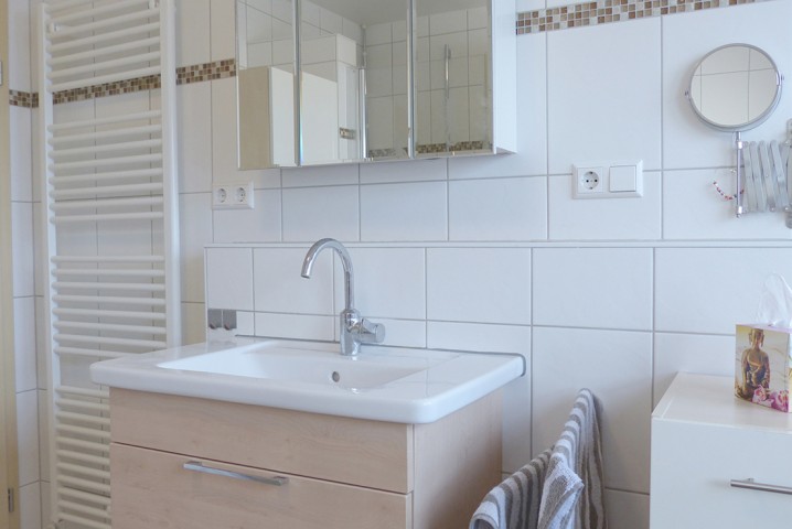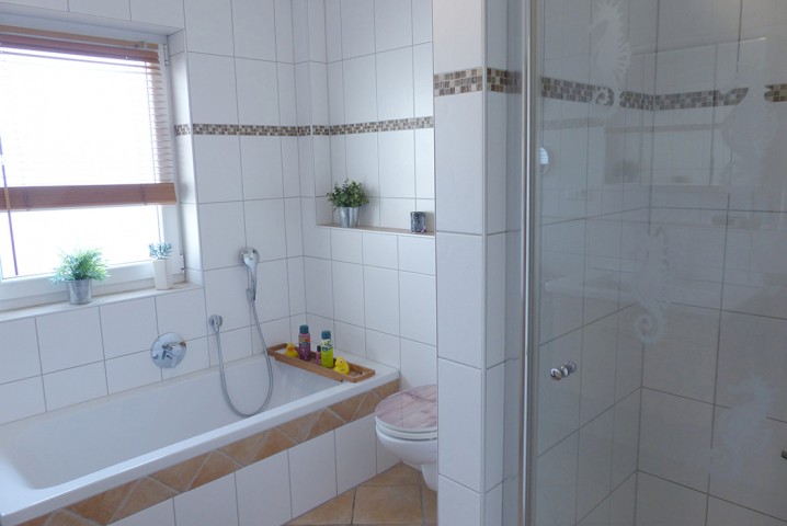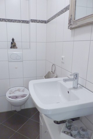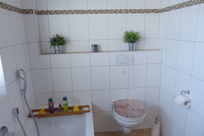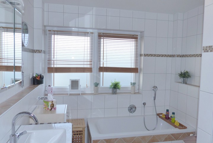 Vom Flur-Bereich aus betreten Sie alle Zimmer. Rechter Hand finden Sie als ersten Raum das Büro oder Gästezimmer. Anschließend betreten Sie das Tageslichtbad, Ihren neuen Wellness-Bereich. Helle Installationen überzeugen in einem durchgängig mediterran-modernen Stil. Entscheiden Sie selbst: Duschen oder Baden? Beides ist möglich. Das separate Gäste-WC ist ebenfalls zeitgemäß mit Vorwand-Installation ausgestattet.