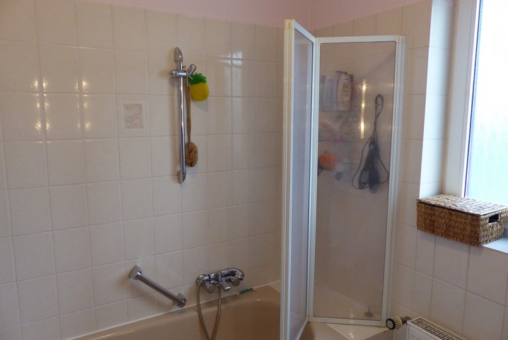 Die Wohnung verfügt zudem über ein Tageslichtbad und ein Gäste-WC. Das Bad sowie das separate WC sind an den Wänden hell und neutral gefliest, jeweils mit farbgleichem Bodenbelag.