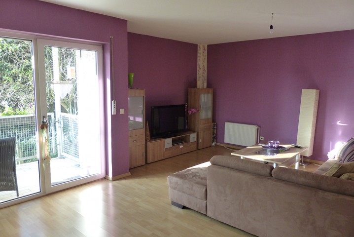 Alle Fenster sind isolierverglast, innen in weißer Kunststoffoptik, außen in farblich akzentuierten Rot. Über eine Flügeltür betreten Sie den Balkon, der einen eigenen Zugang zur nutzbaren Grünfläche hat.