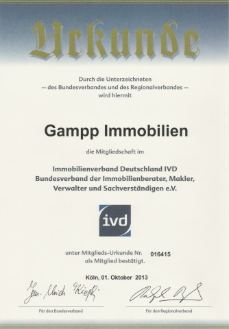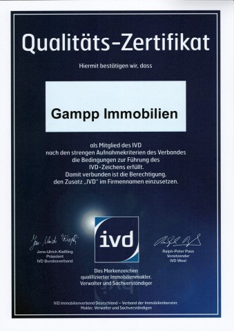 Der Immobilienverband Deutschland ist die Vereinigung geprüfter Immobilienmakler, Verwalter und Sachverständiger – und steht als Markenzeichen für Kompetenz und Seriosität der Mitglieder. Die Mitgliedschaft im IVD steht als Qualitätssiegel aber nicht nur für Ausbildung und Vertrauenswürdigkeit. Vielmehr haben es die Aufnahmeregeln „in sich“: Nachweis der Qualifikation, Einhaltung der Standesregeln, Verpflichtung zur ständigen Weiterbildung und Abschluss von Versicherungen wie Berufshaftpflicht und Vermögensschadenversicherung. Alles zum Vorteil und Schutz der Kunden. Das passt zur Philosophie von Gampp Immobilien, den wohnraumfreunden! Schon deshalb war es uns ein wichtiges Anliegen, die IVD-Mitgliedschaft anzustreben. Nun sind wir stolz, die Aufnahme geschafft zu haben! Freuen Sie sich mit uns – Papier soll zwar geduldig sein, aber mit diesem Zertifikat wissen Sie als Kunde, dass Sie bei unseren Dienstleistungen auf der sicheren Seite sind ! Mehr Informationen zum IVD…