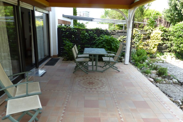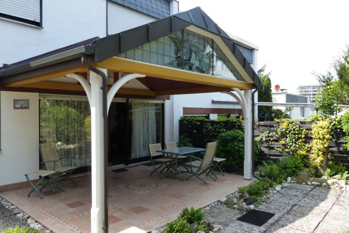 Vom Essbereich aus öffnet sich Ihnen die Tür zur Außenfläche. Die Terrasse und der Garten sind dabei ebenerdig zu begehen. Hier genießen Sie unter der hochwertigen Holz-Pergola mit farbigen Glas-Elementen die Auszeit vom Trubel. Der Garten wird von Blumenrabatten gesäumt. Dieser Bereich kann auch seitlich neben dem Haus betreten werden.