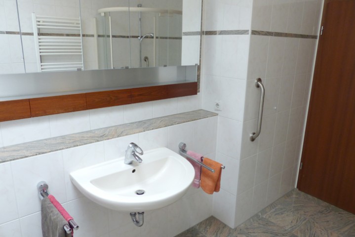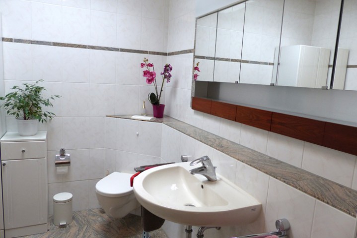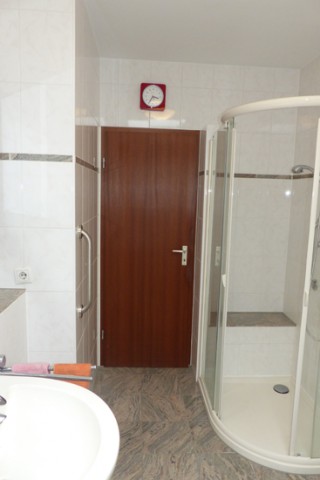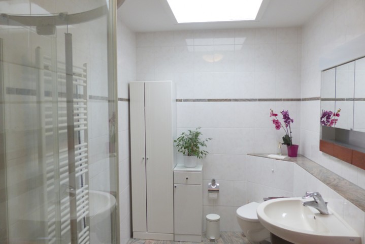 Das Tageslicht-Bad im Obergeschoss ist mit Dusche ausgestattet und verfügt über einen integrierten Einbau-Spiegelschrank mit Ablagefläche. Mit ca. 7,5 m² bietet das Bad Raum für einen frischen Start in den Tag. Im Bad und Flur ist je eine neuwertige Dach-Fensterkuppel installiert, Luft und Licht willkommen!