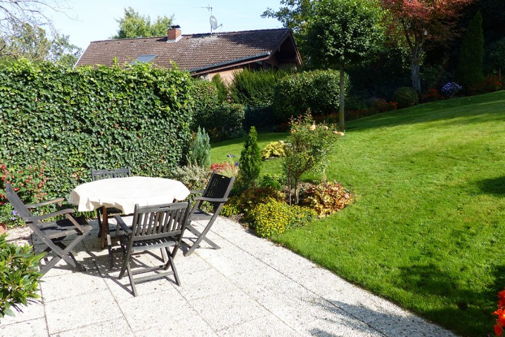 Hier genießen Sie auf der Terrasse und im wunderbar angelegten Garten die Auszeit vom Alltags-Trubel mit Blick ins Grüne.
